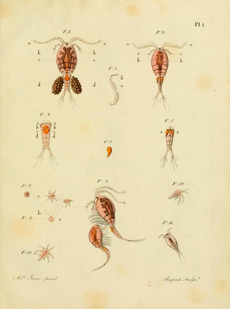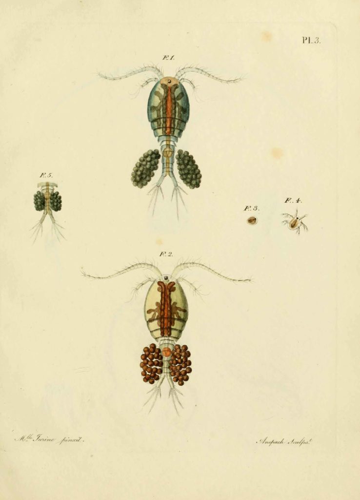 Ces Monocles dont parle Jurine sont en réalité un mélange de différents groupes de petits crustacés: les copépodes et les cladocères. Bien qu’il les ait séparés en deux divisions et trois familles, il a tout mis dans le même genre, le Monoculus de Linné, malgré le fait que des scientifiques comme Otto Müller (1730-1784) ou Pierre-André Latreille (1762-1833) aient déjà proposé une classification plus diverse de ces animaux.