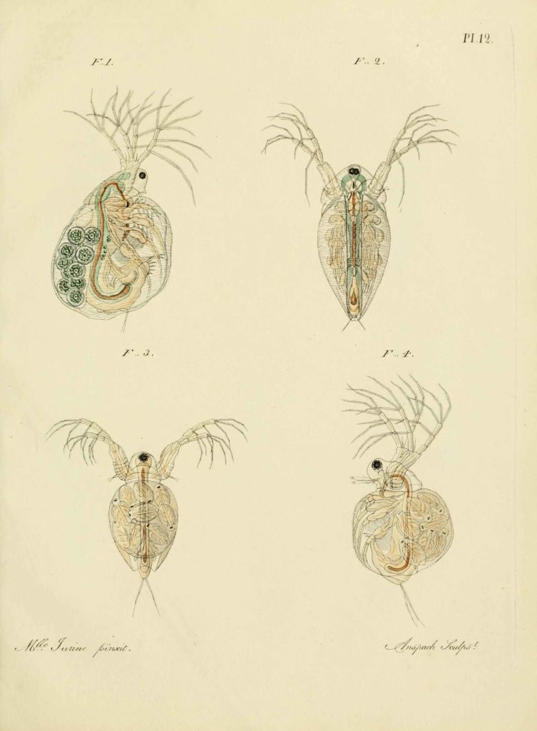 Parmi les multiples sujets étudiés par Jurine, on trouve les micro-crustacés d’eau douce. Sa monographie sur les «Monocles» a été publiée juste après sa mort en 1820. Dans la préface, il y écrit: «Il y a bien des années que j’ai entrepris l’étude des Monocles qui se trouvent aux environs de Genève, et depuis ce moment il est peu de jours que je ne m’en sois occupé avec un nouveau plaisir. Un tel intérêt peut paraître surprenant au premier coup-d’œil, mais si l’on considère le nombre et la petitesse de ces animaux, on sentira qu’il a fallu bien du temps pour acquérir des notions un peu exactes sur leur organisation et leurs mœurs. Il n’en est pas d’un objet microscopique comme d’un autre qu’on aperçoit à la simple vue. La difficulté est bien plus grande quand il faut étudier des animaux toujours en mouvement, les surprendre dans l’exercice de leurs fonctions, et en connaître les organes sous leurs différents rapports.».